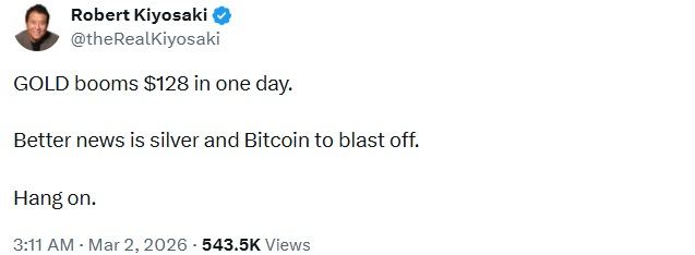 Rich Dad Poor Dad author and investor Robert Kiyosaki shared on social media platform X on March 2 that gold surged sharply in a single day while signaling potential major moves ahead for silver and bitcoin as investors reacted to rising geopolitical tensions and volatility across global financial markets.