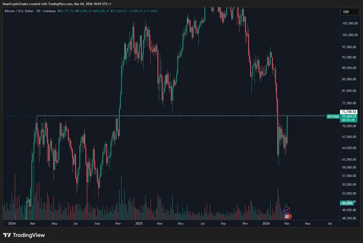 Bitcoin is pressing into a tight decision zone after breaking an earlier resistance area near $71,500. Now, traders are watching whether the move can hold and reclaim the $74,000 level highlighted by Daan Crypto Trades.