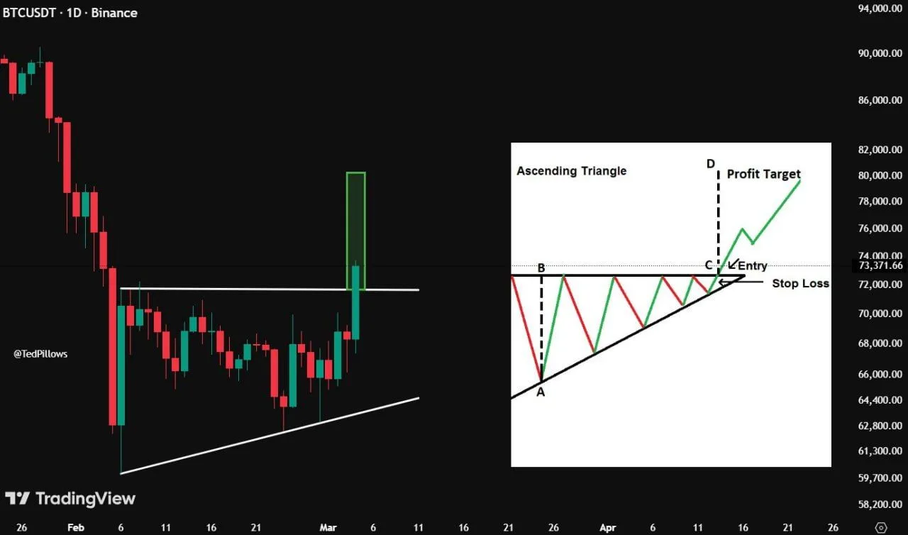 Bitcoin climbed above a key resistance zone and pushed into the low $73,000s on the daily BTCUSDT chart on Binance, according to a TradingView snapshot shared by market commentator TedPillows on X. The move followed weeks of tighter trading inside an ascending triangle, where higher lows pressed against a flat ceiling.