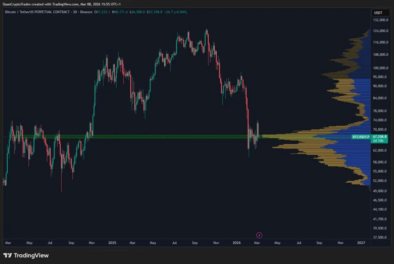 Meanwhile, the chart shared by Daan Crypto Trades shows Bitcoin trading inside the largest volume area formed over the past two years. The volume profile on the right highlights where the most trading activity occurred. The thickest cluster sits around the current level marked by the horizontal green line.