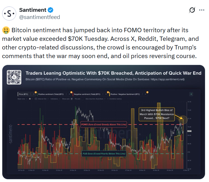 Social media sentiment over Bitcoin has shifted back to optimism as Bitcoin recovered to over $70,000 on Tuesday, driven by US President Donald Trump’s recent comments that the war with Iran could be nearing an end.