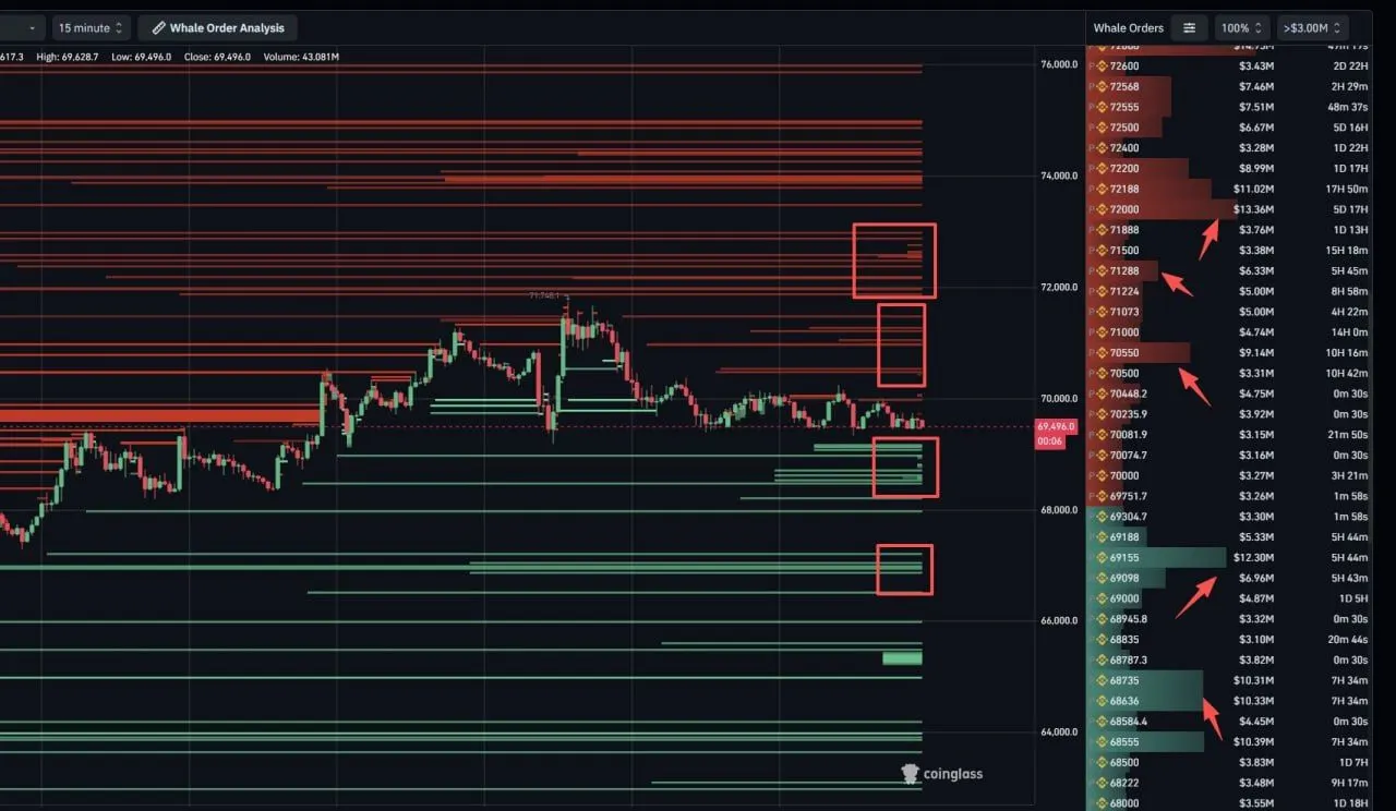 Meanwhile, Bitcoin is trading inside a tight whale liquidity zone, with heavy sell orders stacked between $71,000 and $72,500 and strong bid support clustered around $69,000 to $68,700, according to a CoinGlass whale order chart. That setup suggests price is being compressed between large opposing liquidity blocks, which often leads to a sharper move once one side gives way.