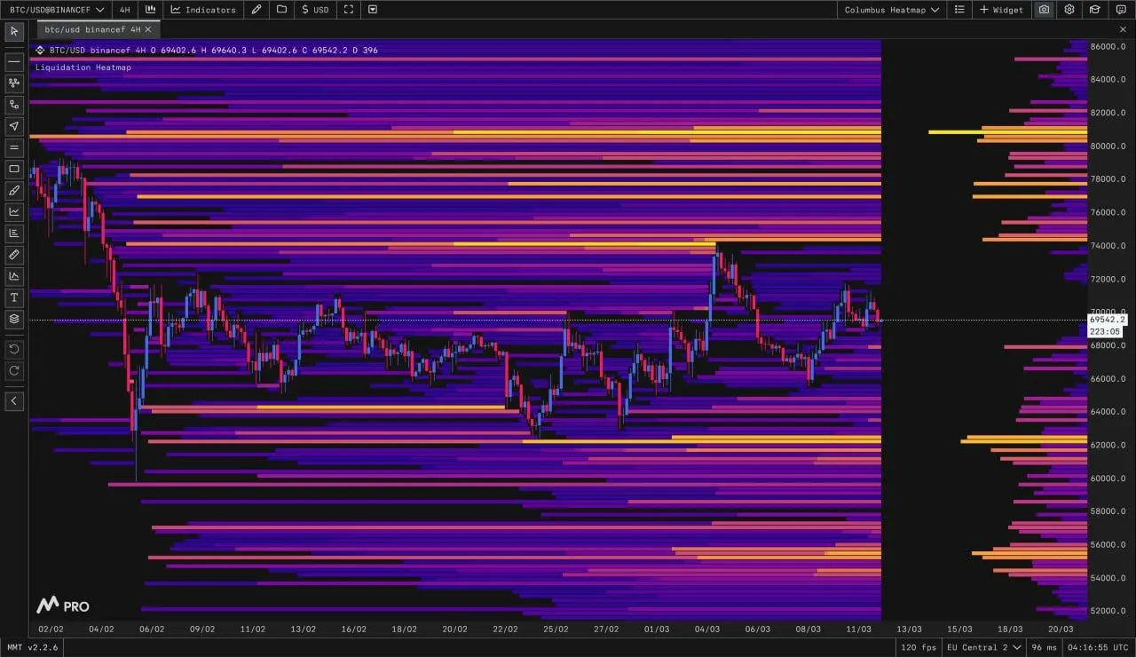The chart therefore suggests a two-step structure. First, Bitcoin may revisit the $68,000 zone where bids are already visible. Then, if buyers defend that area, the broader setup could support continuation toward higher liquidity clusters above the current range.