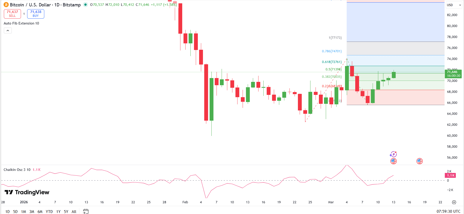 Bitcoin’s daily chart on TradingView shows an improving bullish structure. This came after price pushed through the 0.382 Fibonacci level near $70,035 and then reclaimed the 0.5 retracement around $71,398.