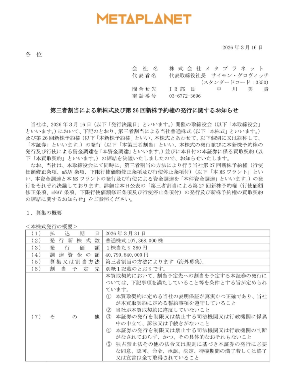 The fundraising effort forms part of the company’s broader push to expand its bitcoin treasury. Metaplanet said it intends to allocate up to 56.9 billion yen, or about $357 million, toward purchasing additional bitcoin between April 2026 and March 2028.