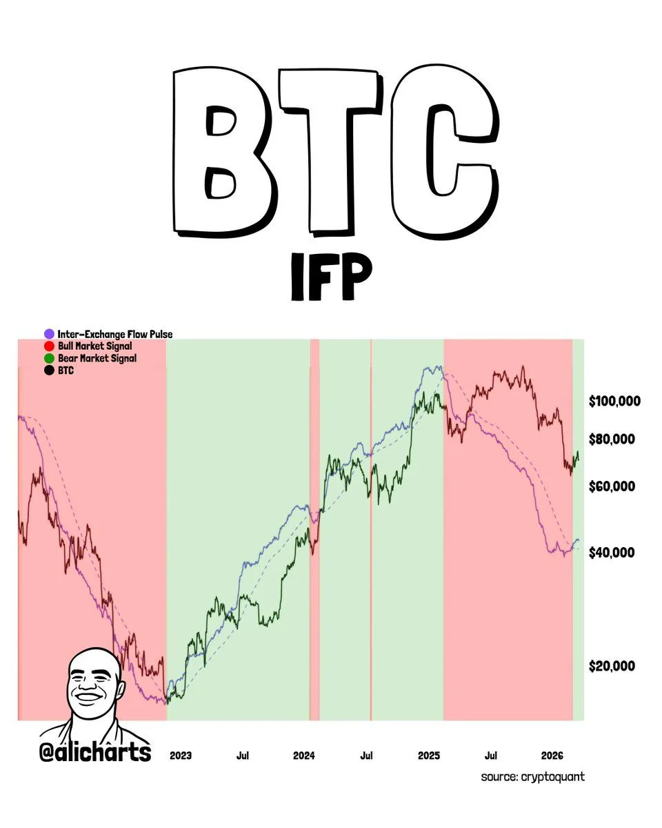 Bitcoin may be showing an early sign of renewed strength after the Inter Exchange Flow Pulse, or IFP, started rising again, according to a chart shared by Ali Charts using CryptoQuant data. The indicator tracks the movement intensity of Bitcoin between centralized exchanges and is often used to gauge shifts in market liquidity. In the latest chart, the IFP appears to be turning up after a long decline, while Bitcoin also starts to recover from a recent drop.