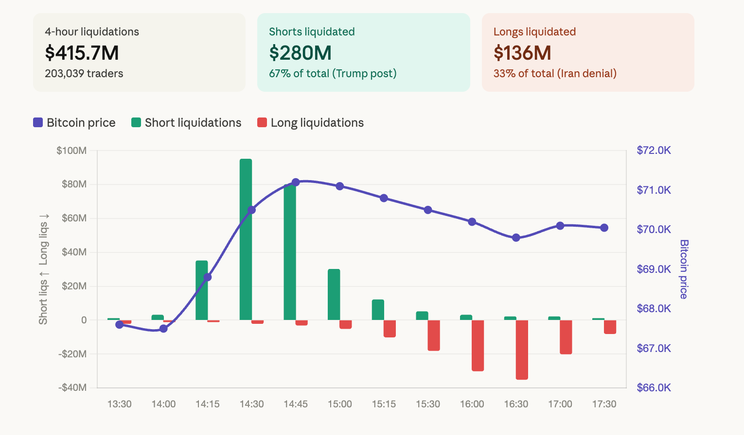 CoinGlass data shows $415 million in liquidations in the four-hour window around the two headlines, with short liquidations accounting for $280 million and longs taking $135 million. The nearly 2-to-1 ratio suggests the market was heavily positioned for escalation when Trump's post landed.