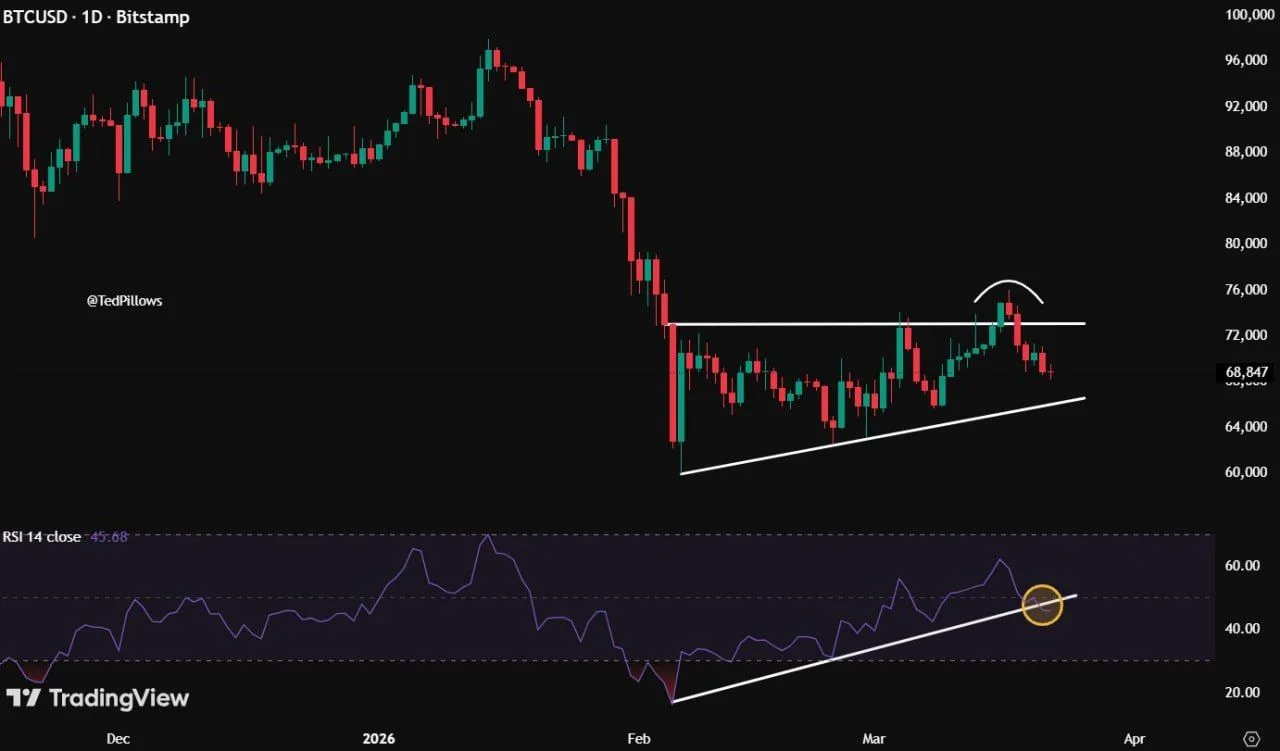 The chart shared by Ted Pillows shows Bitcoin losing an RSI uptrend on the daily timeframe, a signal that may point to fading momentum after the recent rebound. The setup compares the current move to the pattern seen in January 2026, when momentum weakened before price moved lower.