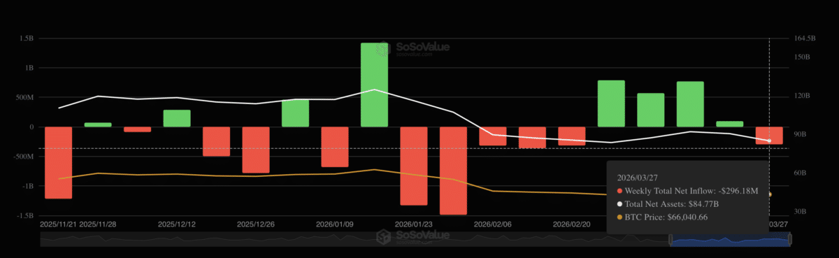 Roughly $296 million exited these funds over the past week, reversing part of the $2.12 billion accumulated over the previous four weeks. The shift suggested that recent buyers may be beginning to unwind positions as macro risks intensify.
