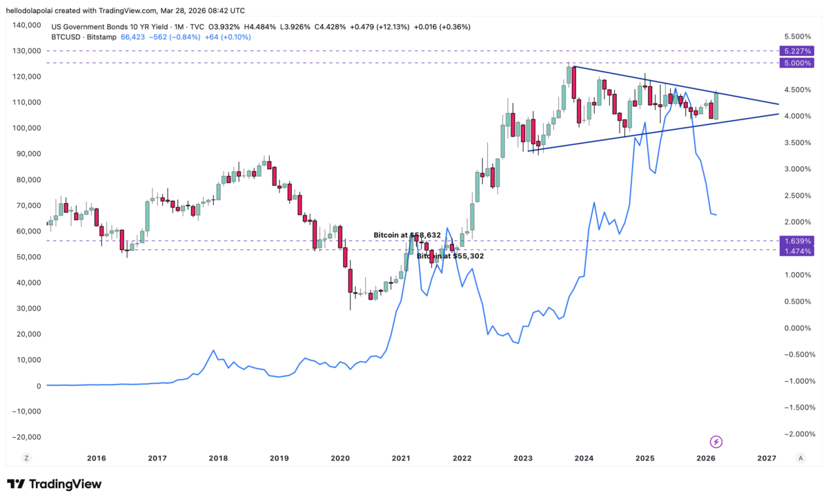 Between October 2021 and December 2022, for instance, yields rose from 1.45% to 3.90%. All while Bitcoin fell from $67,000 to $16,256 over the same period.