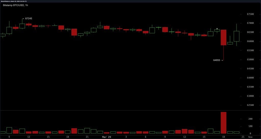 At press time, at 8:25 p.m. Eastern on Sunday evening, bitcoin is changing hands for $66,778 per unit, indicating incredible volatility and a significant bounce back over the last hour.