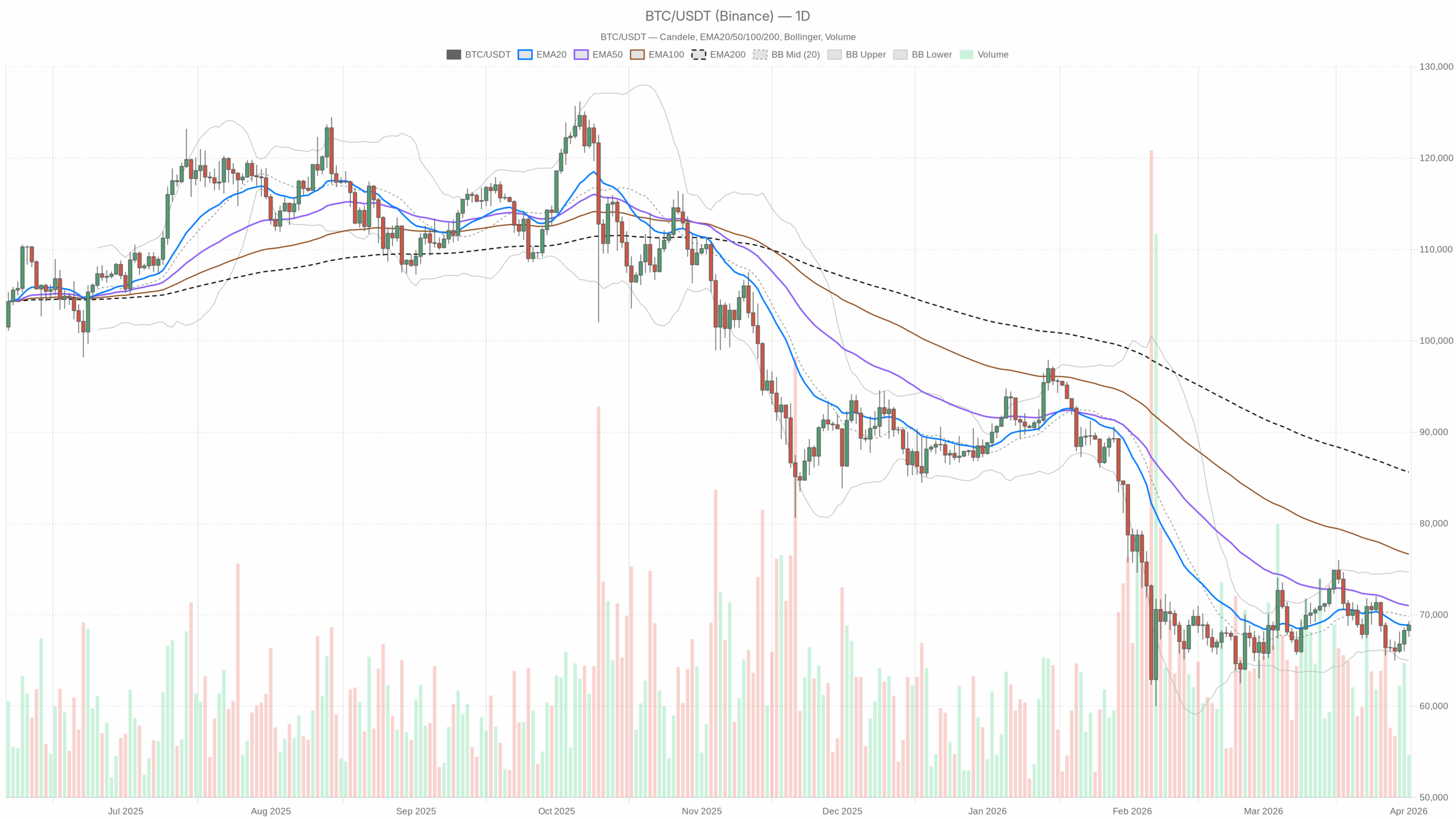 The daily timeframe is our anchor, and it currently points to a mildly bearish main scenario. Price sits at $68,865, almost exactly on the 20-day EMA at $68,886 and below the 50-day EMA at $71,005. The 200-day EMA at $85,615 is far above, but that is more a reflection of the prior parabolic leg than of current pressure.