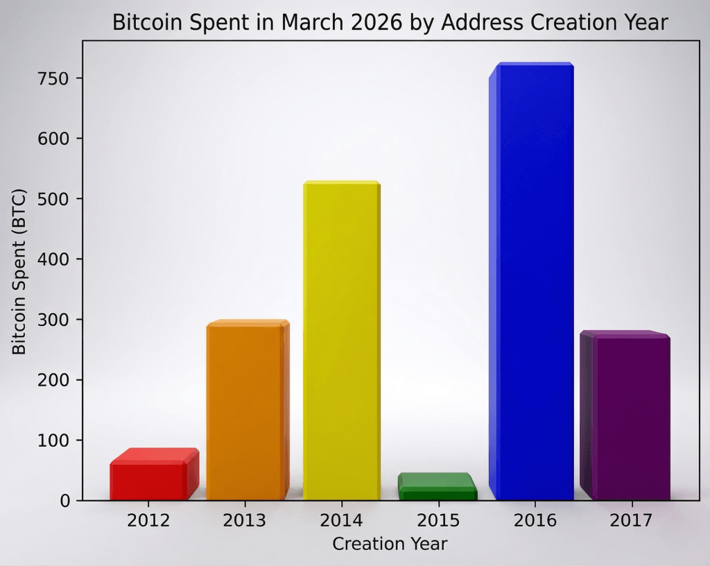 Four wallets created in 2012 spent 64.71410645 $BTC in March, and one 2015-era address accounted for 20.00010547 $BTC. The 2012 cohort activity is worth noting separately. Those addresses carry coins that survived bitcoin’s earliest years, before any significant exchange infrastructure existed.