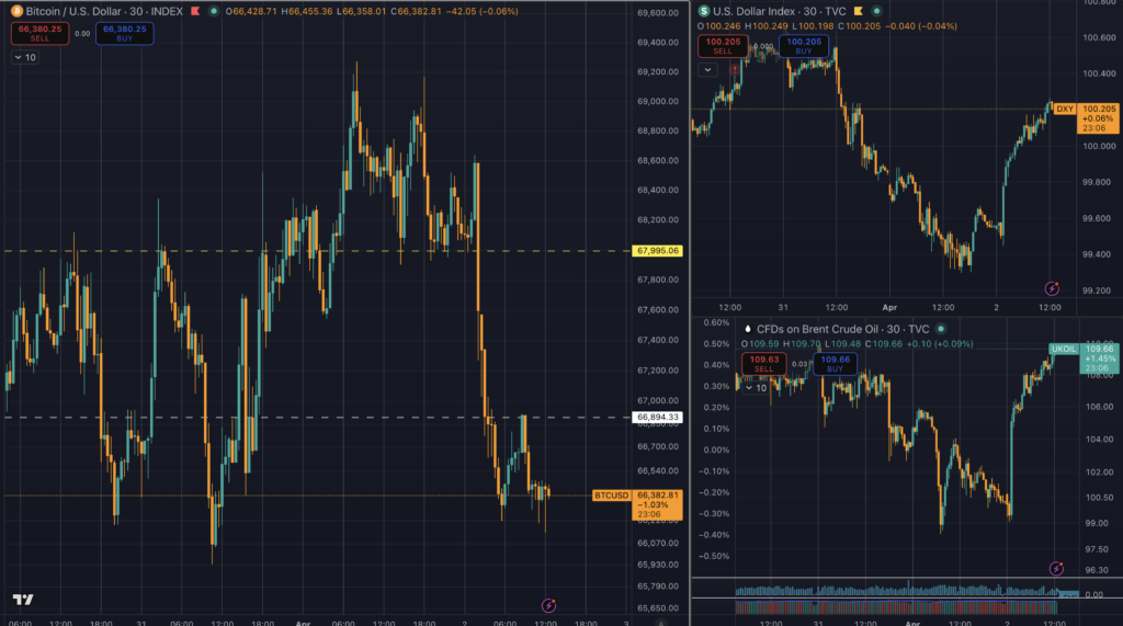 The broader market context over the last 24 to 48 hours adds another layer to the chart. Alongside Bitcoin moving lower, the comparison view showed the U.S. Dollar Index rebounding above 100 while Brent crude pushed toward $108.