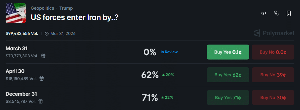 In fact, prediction site Polymarket was pricing a 62% chance of a U.S. ground invasion in April.
