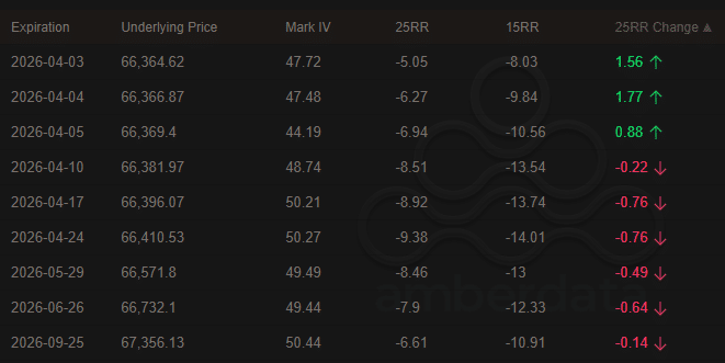 This was illustrated by a key metric, 25-Delta Risk Reversal (25RR), which has turned negative for all April Option expiries. In simple terms, it meant more demand for puts (hedging against downside risk) than calls (bullish bets).