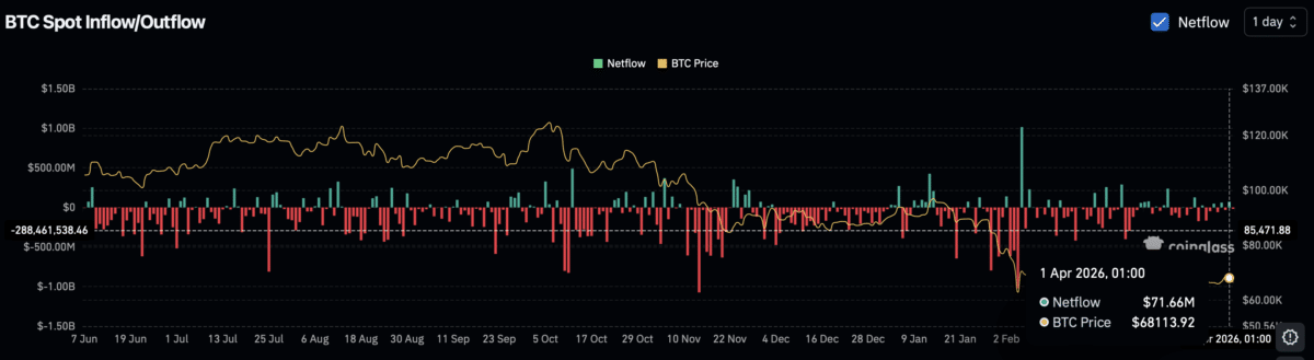 Over the past week, the market has recorded limited buying and selling pressure. As of the 1st of April, net inflows totaled approximately $71 million, indicating relatively low sell-side activity.