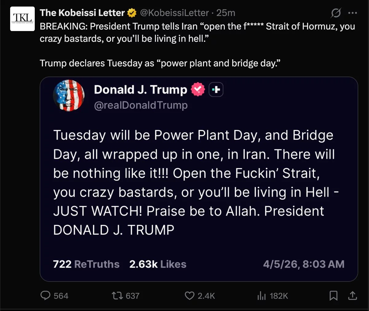 At the same time, traders watched new posts from The Kobeissi Letter about comments attributed to Donald Trump on Iran and the Strait of Hormuz.