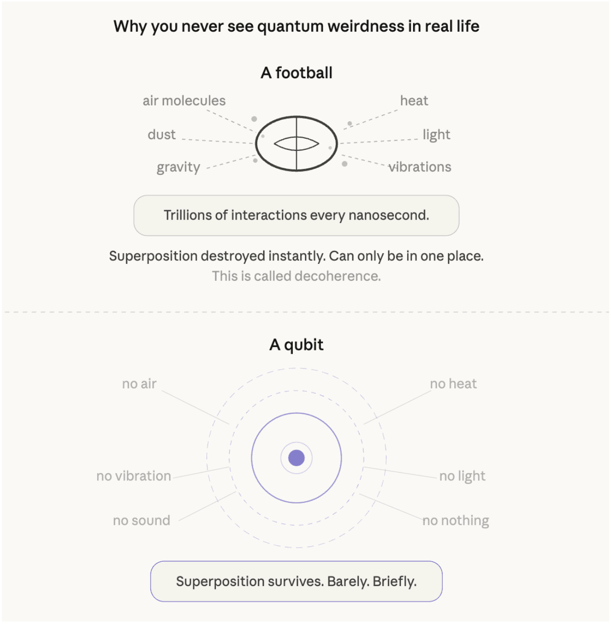 A football cannot be in two places at once because it is interacting with trillions of air molecules, dust, sound, heat, gravity, etc., every nanosecond. But isolate a tiny current in a near-absolute-zero vacuum, shield it from every possible disturbance, and the quantum behavior survives long enough to compute with.