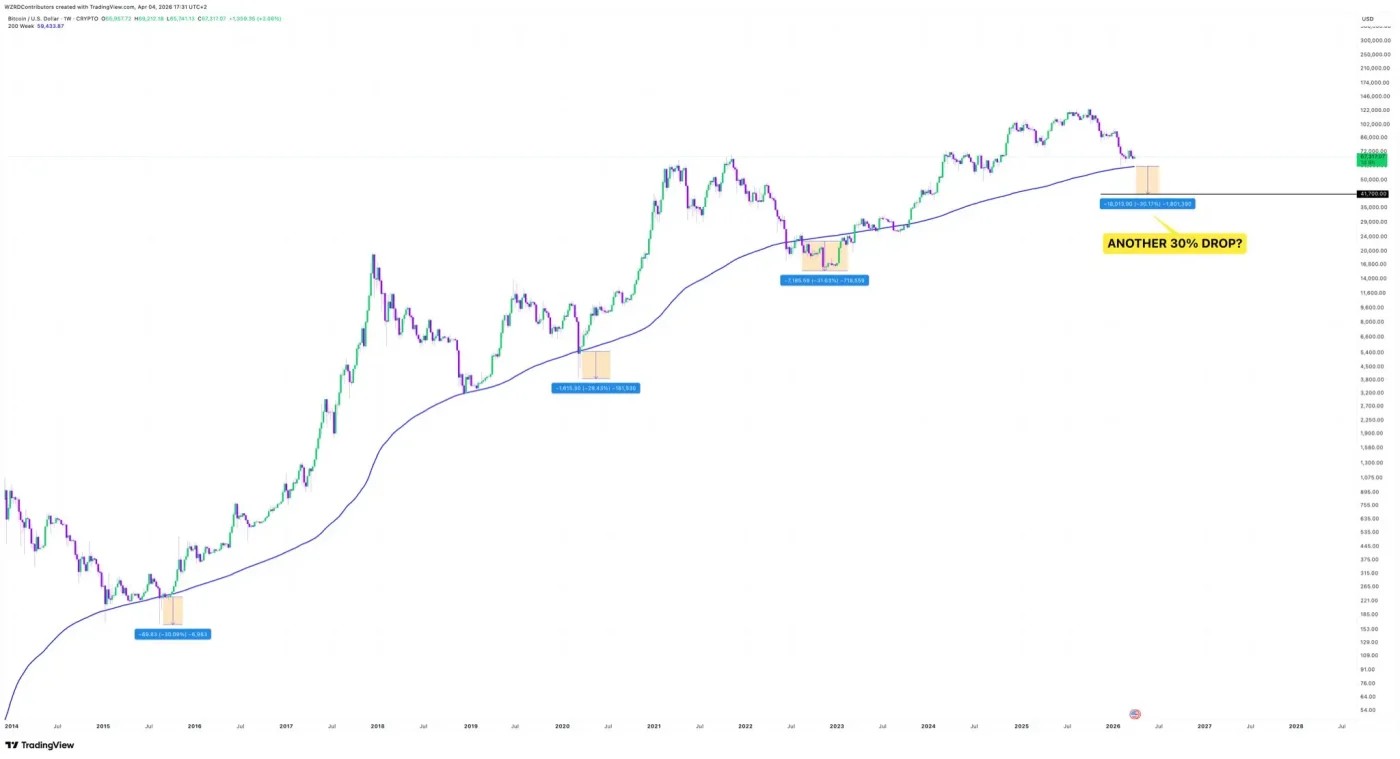 Even so, the chart presents the scenario as a historical comparison, not a confirmed outcome. The message is that if Bitcoin repeats prior cycle behavior, another 30% drop beneath the 200-week EMA could still be possible.