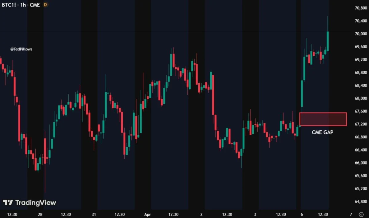Ted said most CME gaps get filled within a week, so the $67,500 region has become an area to watch. In other words, if Bitcoin pulls back in the near term, traders may look for a move into that gap zone first. A drop toward that level would not automatically change the broader trend, but it would show that the market is revisiting an unfinished area left by the breakout.