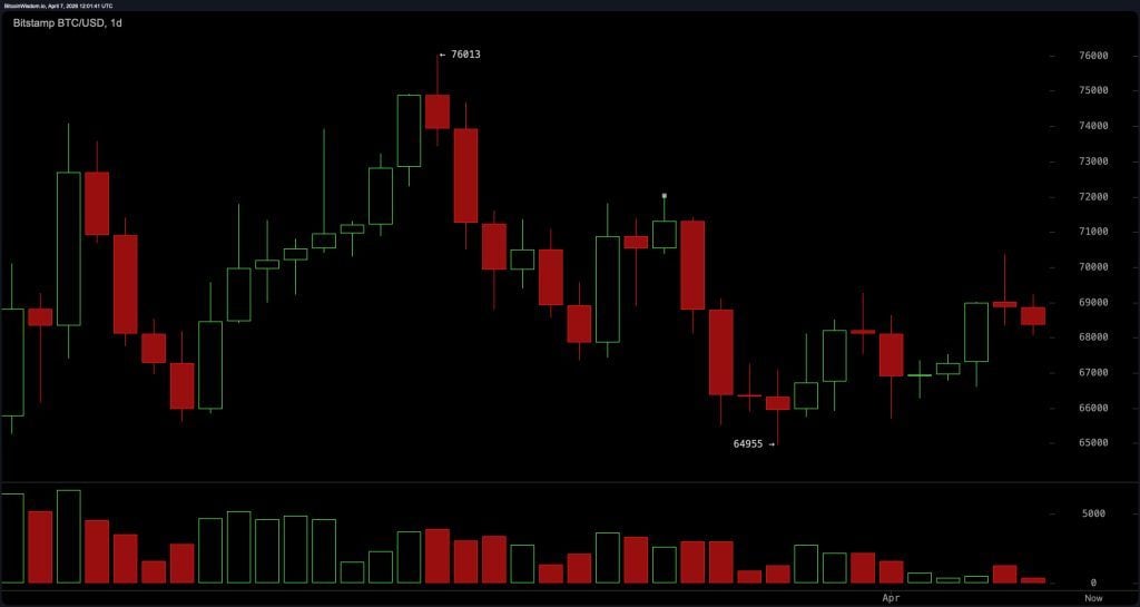 - Bitcoin held above ~$68,000 on April 7, 2026, stuck below $70,000 resistance.