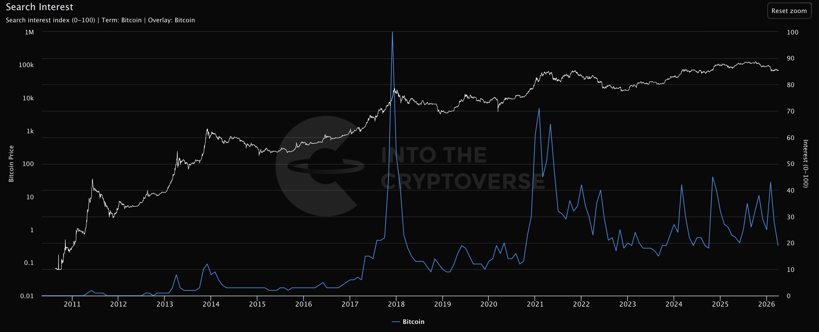 In earlier bull runs, especially around 2017, spikes in Google searches closely tracked Bitcoin’s price surges. For instance, as Bitcoin traded near $20,000 in late 2017, retail search interest reached a maximum score of 100.