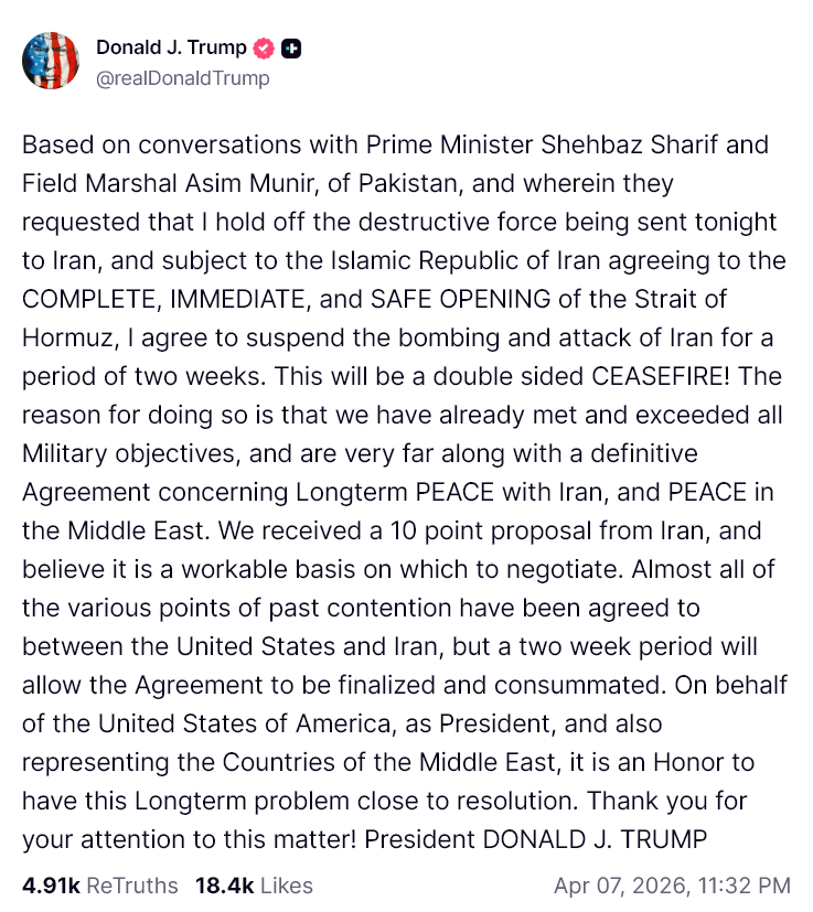 In a post on Truth Social, Trump said he agreed to suspend strikes on Iran for two weeks following direct conversations with Pakistan’s PM and Army Chief Asim Munir.