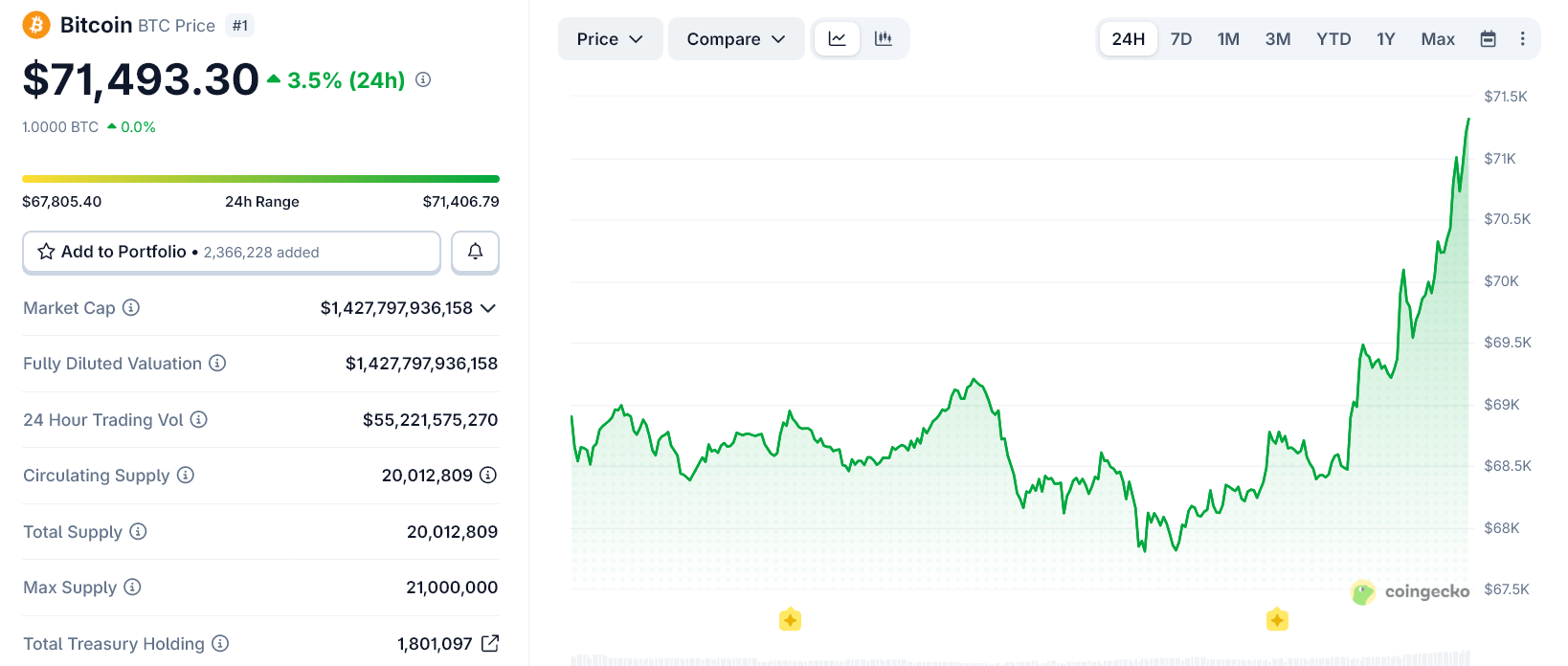 Bitcoin jumped to around $71,500 late April 7 after US President Donald Trump announced a sudden pause in planned military action against Iran, signaling a potential de-escalation in the ongoing conflict.