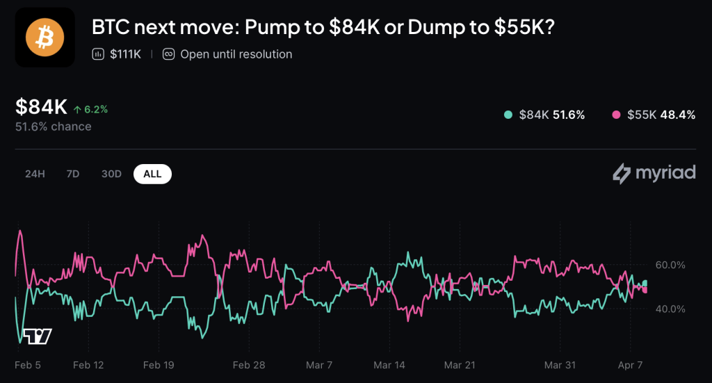On the Myriad platform, a separate market is tracking whether bitcoin will hit $84,000 or $55,000 first. The two outcomes are nearly even, with the bullish case carrying a 51.6% to 52% probability and the bearish $55,000 scenario sitting at approximately 48% to 48.4%.