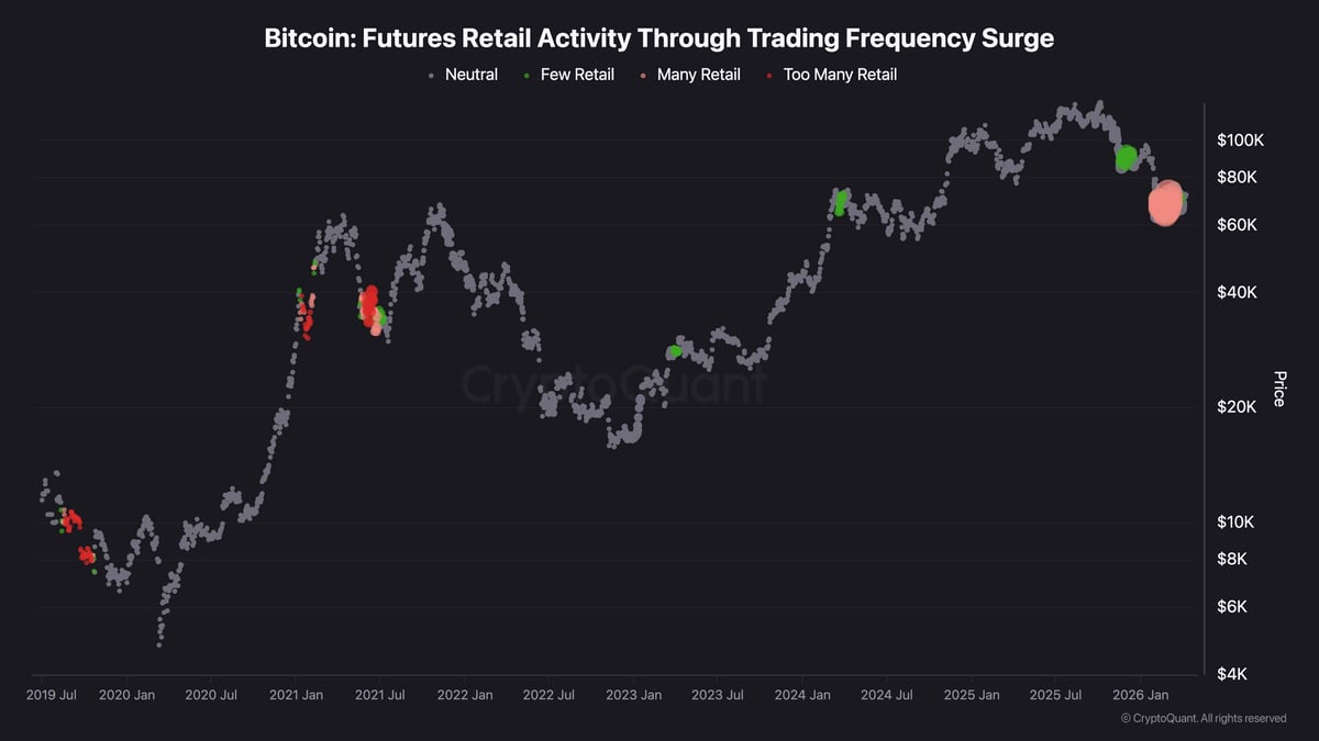 The Futures Retail Activity indicator is flashing one of the more interesting signals seen in this correction cycle. After a brief cluster of “Few Retail” green dots appeared near the $85k–$90k range in late 2025 — historically a bullish signal indicating under-participation — the current reading has shifted to a large “Many Retail” cluster right at current prices around $65k–$72k. The size of these dots suggests a significant surge in retail futures activity, likely for speculation.