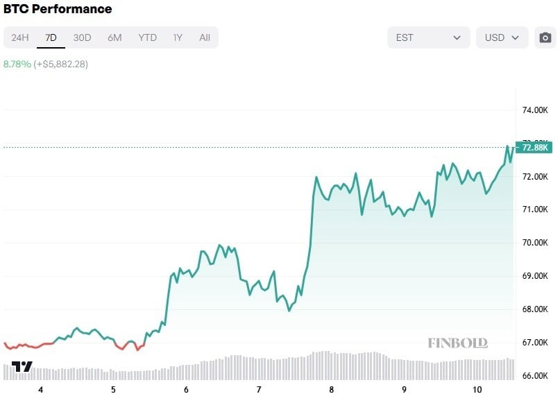 The rise in on-chain activity on the Bitcoin network has coincided with bullish sentiment for $BTC. The flagship coin has surged by over 8% in the past seven days, trading at about $72,880 at press time. As a result, the digital asset added $8.1 billion to its market capitalization over the past 24 hours, bringing it to around $1.5 trillion on Friday, as per data from Finbold.