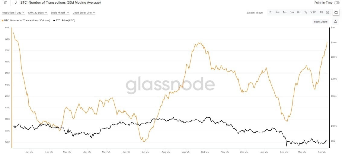 The number of Bitcoin transactions (30D MA), which shows the total number of confirmed on-chain transactions per day, has surged to 514,758 at press time. As such, the number of transactions (30D MA) for $BTC retested the same level it was in mid December 2024, according to metrics from Glassnode.