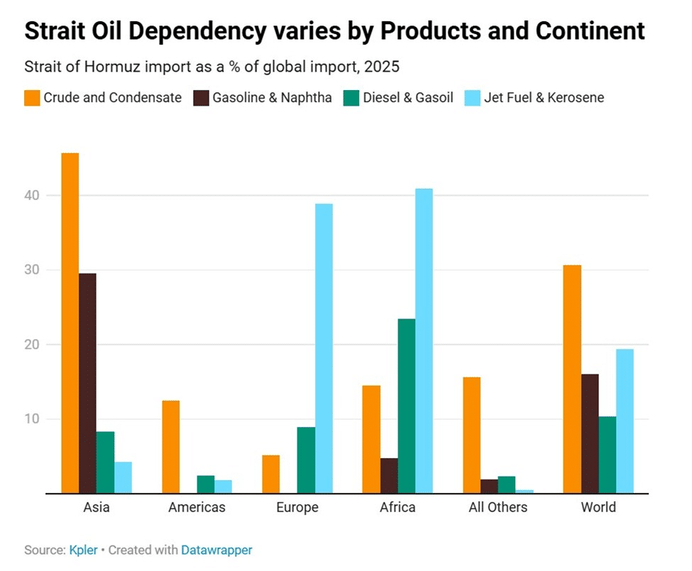 According to The Kobeissi Letter, Asian markets remain the most exposed, with 45% of Asia’s crude oil flowing through the Strait of Hormuz in 2025, the highest dependency globally. Any disruption of the Strait naturally translates into a direct energy supply shock across the region.