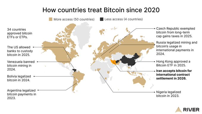 In fact, River’s broader research suggests that at least 50 countries have improved access to Bitcoin through regulatory measures since 2020, compared with only 4 that tightened restrictions.