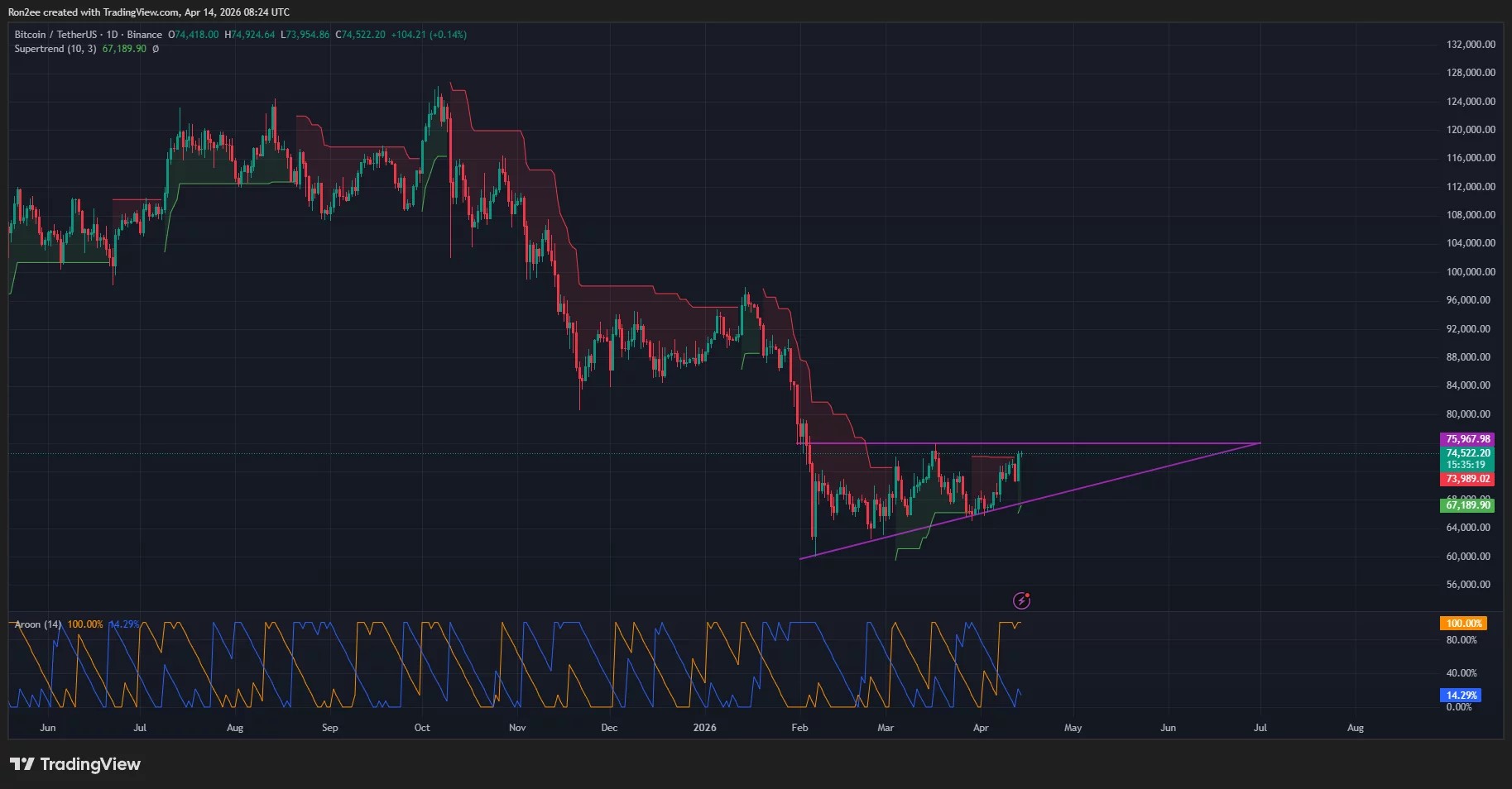 For now, $76,000 is acting as the key resistance level to watch. A decisive breakout above the current triangle could embolden bulls to reach for the next immediate psychological resistance level at $80,000.