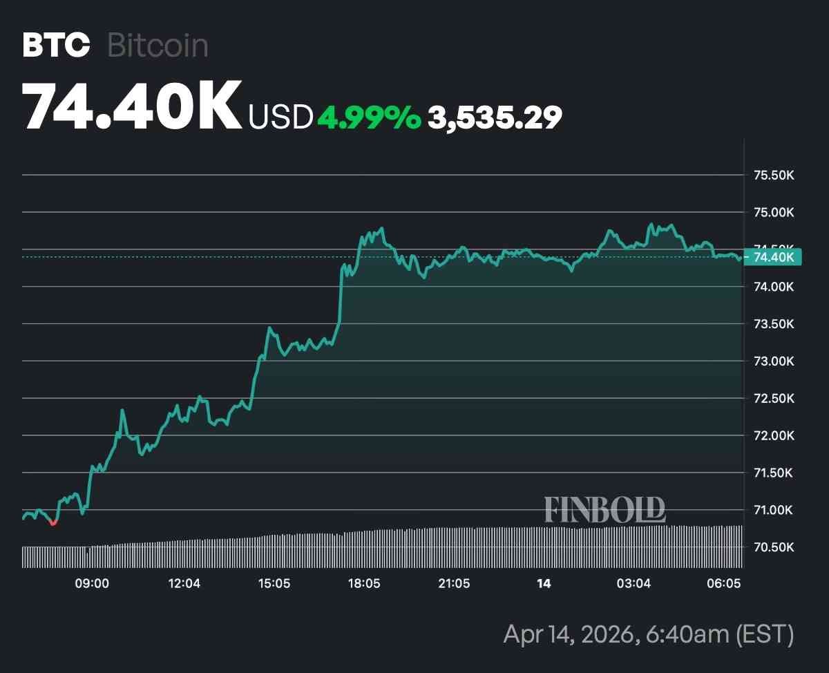 Over the past 24 hours, Bitcoin has risen around 5%, now trading around $74,400 as a wave of short liquidations fueled a sharp upside move.