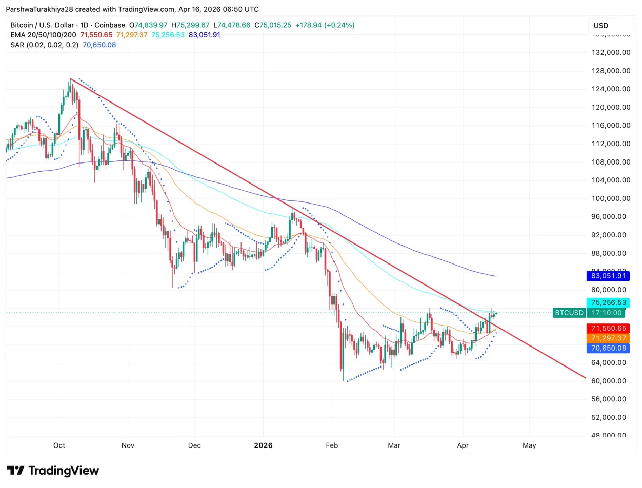 The 20-day EMA at $71,550 and 50-day at $71,297 have crossed below price and act as support. The SAR at $70,650 adds a third layer below. A daily close above $75,266 clears the channel and 100-day EMA at once, with the 200-day EMA at $83,051 as the next target. Losing the 50-day at $71,297 puts the SAR at $70,650 in play, then the February low near $62,000.