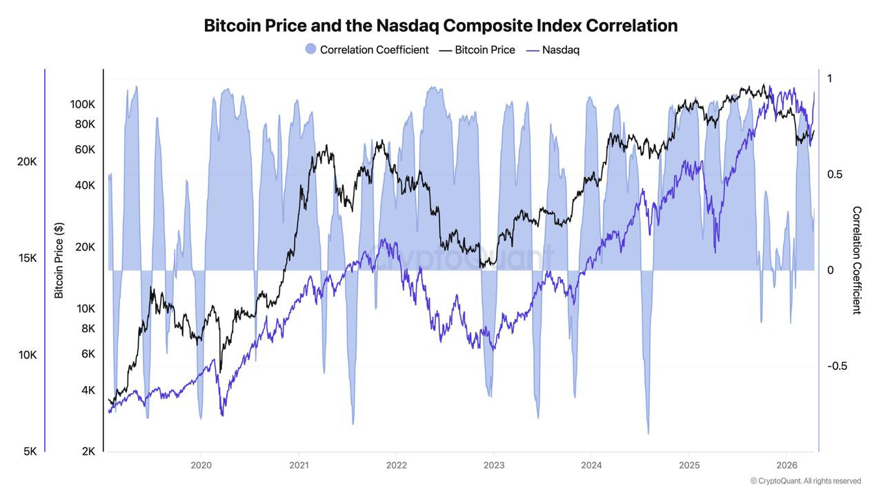 Since the beginning of April, the Nasdaq Composite Index surged over 10%, reaching an all-time high (ATH) of about 24,146 on April 16. On the other hand, Bitcoin’s price has encountered significant resistance around $76,000, which coincides with its March 2026 peak. As such, their correlation has dropped over the past 30 days from nearly 0.9 to approximately 0.3 at press time, according to analytics from CryptoQuant.