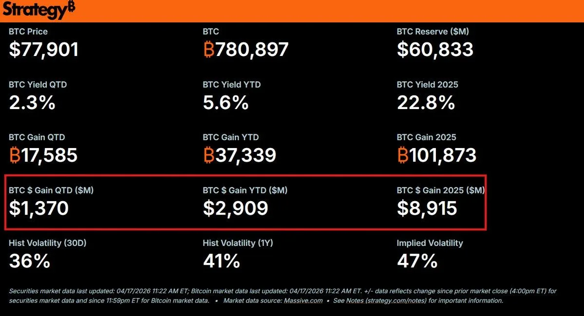 Bitcoin’s move above $77,000 marked its strongest level since the correction that followed the February 5 selloff, when the asset fell close to $60,000. On April 17, Bitcoin traded around $78,209.10 in one market update, while another reading placed it near $77,286.74. That price recovery mattered for Strategy because the company’s large treasury position leaves its valuation highly sensitive to changes in Bitcoin.