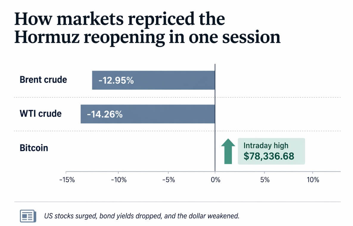 Brent crude fell 12.95% to $86.52, and WTI dropped 14.26% to $81.19, both their lowest levels since Mar. 11 and the largest single-day declines since Apr. 8. US stocks surged, bond yields dropped, the dollar weakened, and Bitcoin registered an intraday high of $78,336.