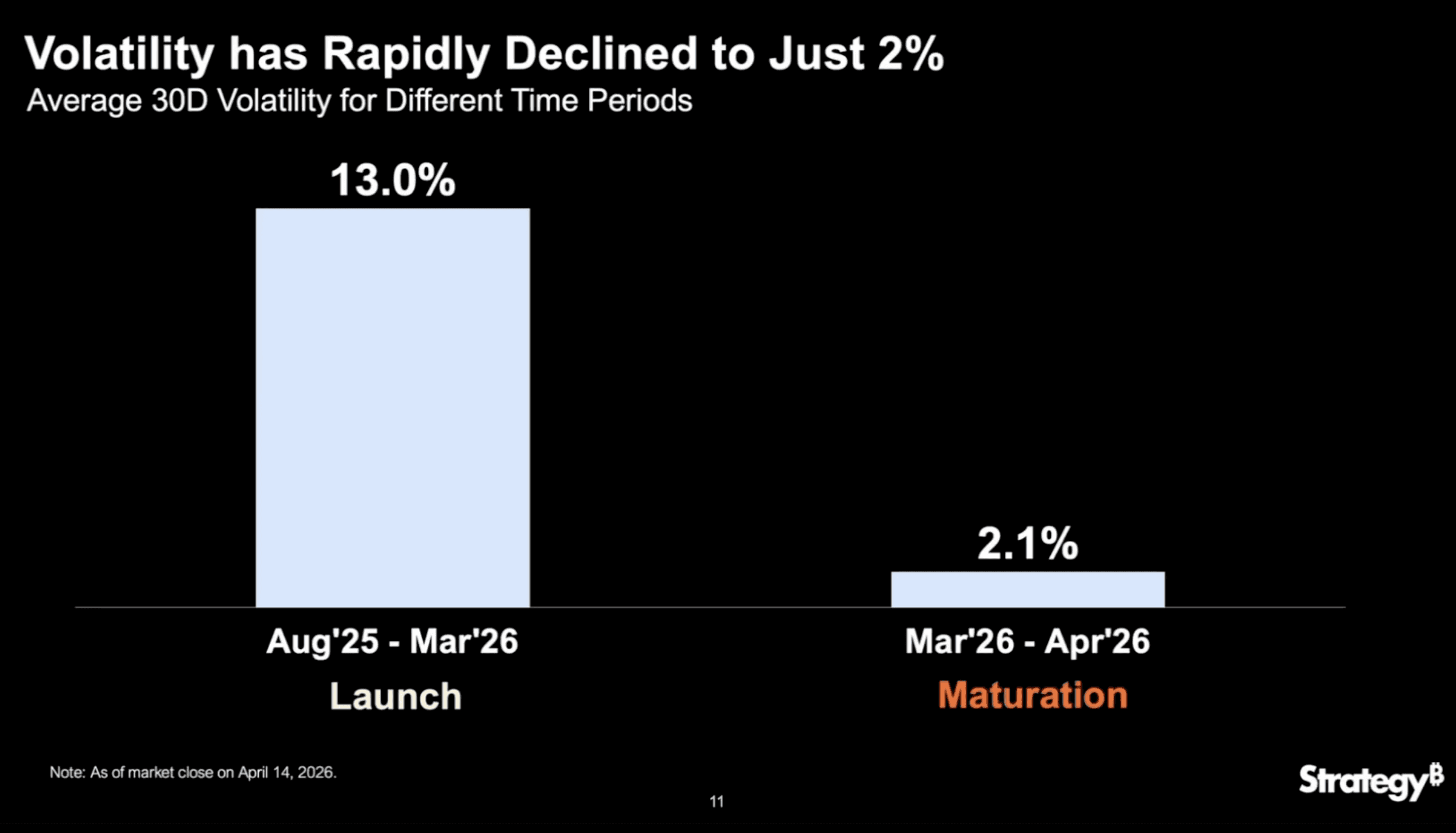 STRC’s historical volatility averaged 13% from August 2025 to March 2026, but dropped to just 2% between March and April 2026, according to Strategy’s data.