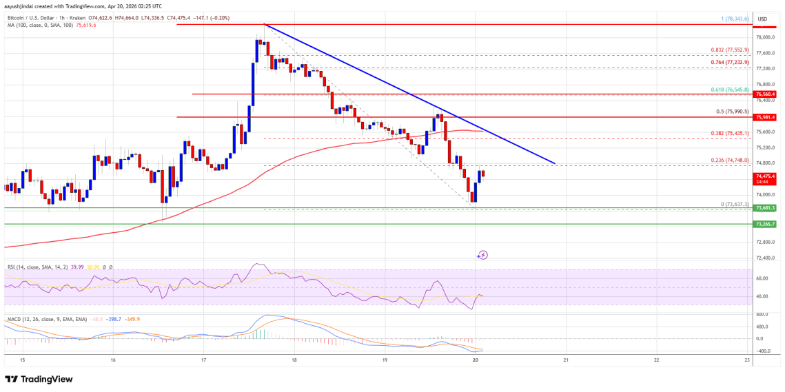 The price dipped below the $75,500 and $75,000 levels. A low was formed at $73,637 and the price is now consolidating losses below the 23.6% Fib retracement level of the downward move from the $78,343 swing high to the $73,637 low.