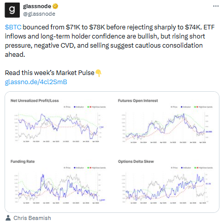 - ETF inflows are absorbing selling pressure and keeping Bitcoin near $75k.