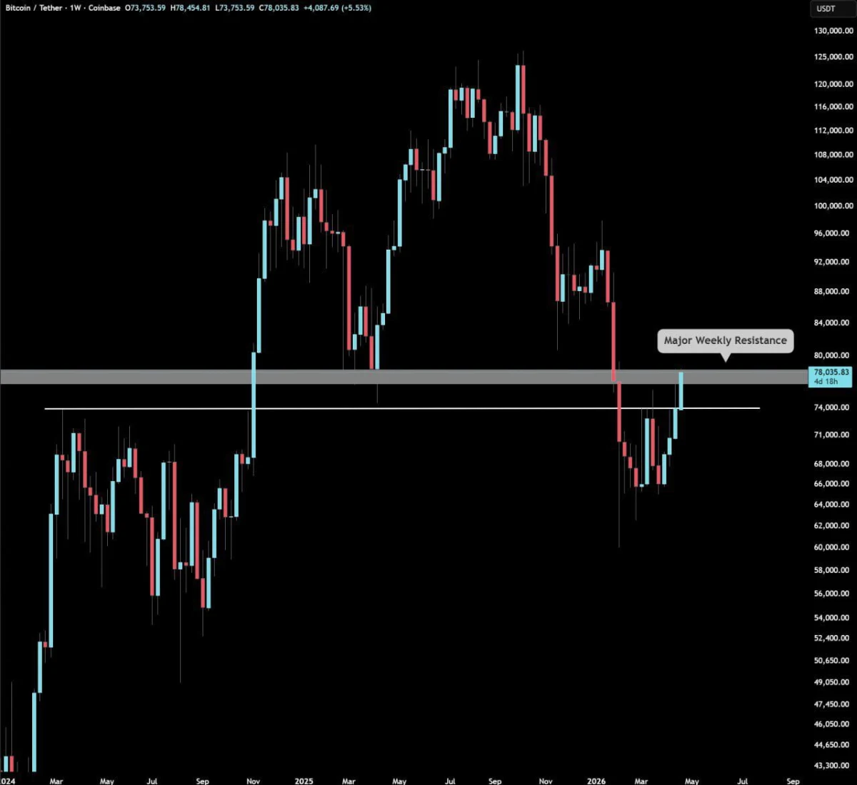 Bitcoin has reached a major weekly resistance zone near $78,000, according to a chart shared by Elja. The image shows $BTC pushing back into a gray resistance band after recovering from a sharp drop earlier in 2026. That move signals strong momentum, but the chart suggests the market has now reached an area that could decide the next trend direction.