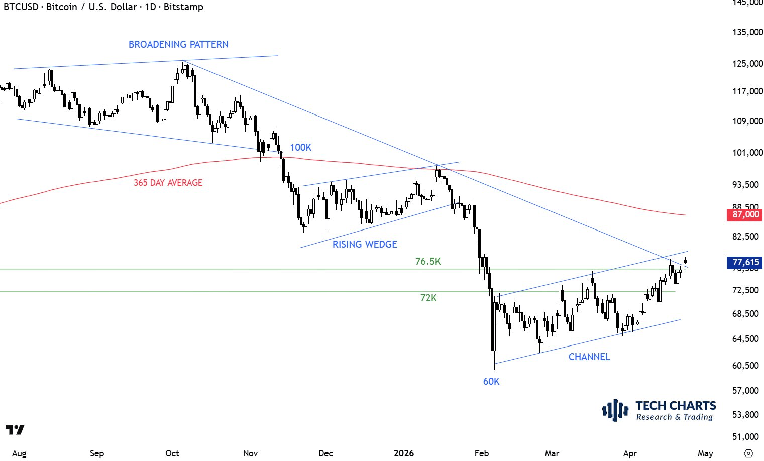 Although Bitcoin price has pumped above the average cost basis of recent buyers, as Finbold explained, it has been rejected twice on the upper boundary of the rising channel. As such, $BTC price could capitulate below $70,000 again to retest the lower bound of the macro bearish flag.
