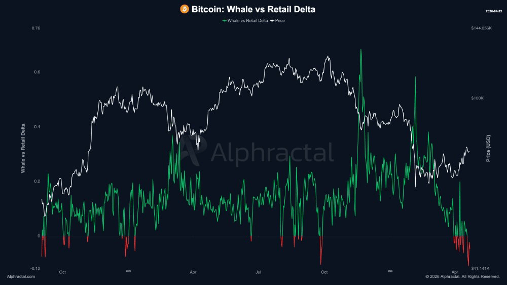 The odds of $BTC price capitulating recently surged after more retail traders added more long leverage positions while whales positioned for a correction, based on metrics from Alphractal. Notably, in the last 5 instances of such a divergence, whales won 4 times against retail traders.