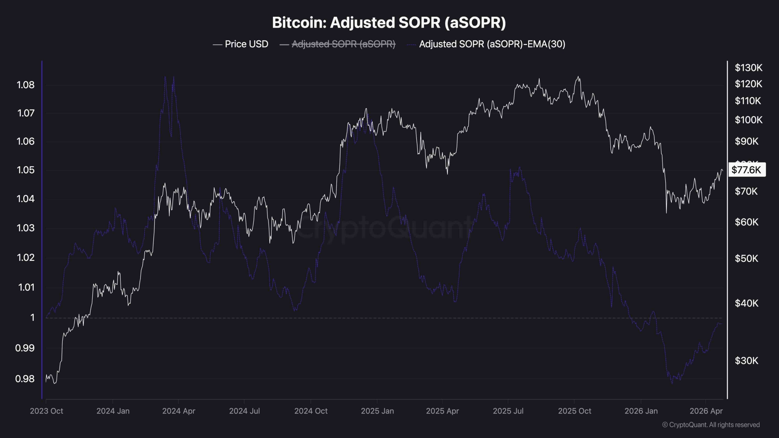 The significance of this recovery cannot be overstated. If aSOPR transitions from below 1.00 to sustainably above it, it marks the point at which the average coin being moved on-chain is back in profit. Historically, that transition has coincided with a shift in market psychology from capitulation and holding to cautious participation and smart money accumulation. The February low appears to have been the capitulation trough for this cycle. Whether $77k proves to be the early stage of a new leg higher or simply a strong relief rally will depend on whether price can break above $80k and the aSOPR can continue trending higher above 1.0, which would mean the market is back in a healthy bullish state.