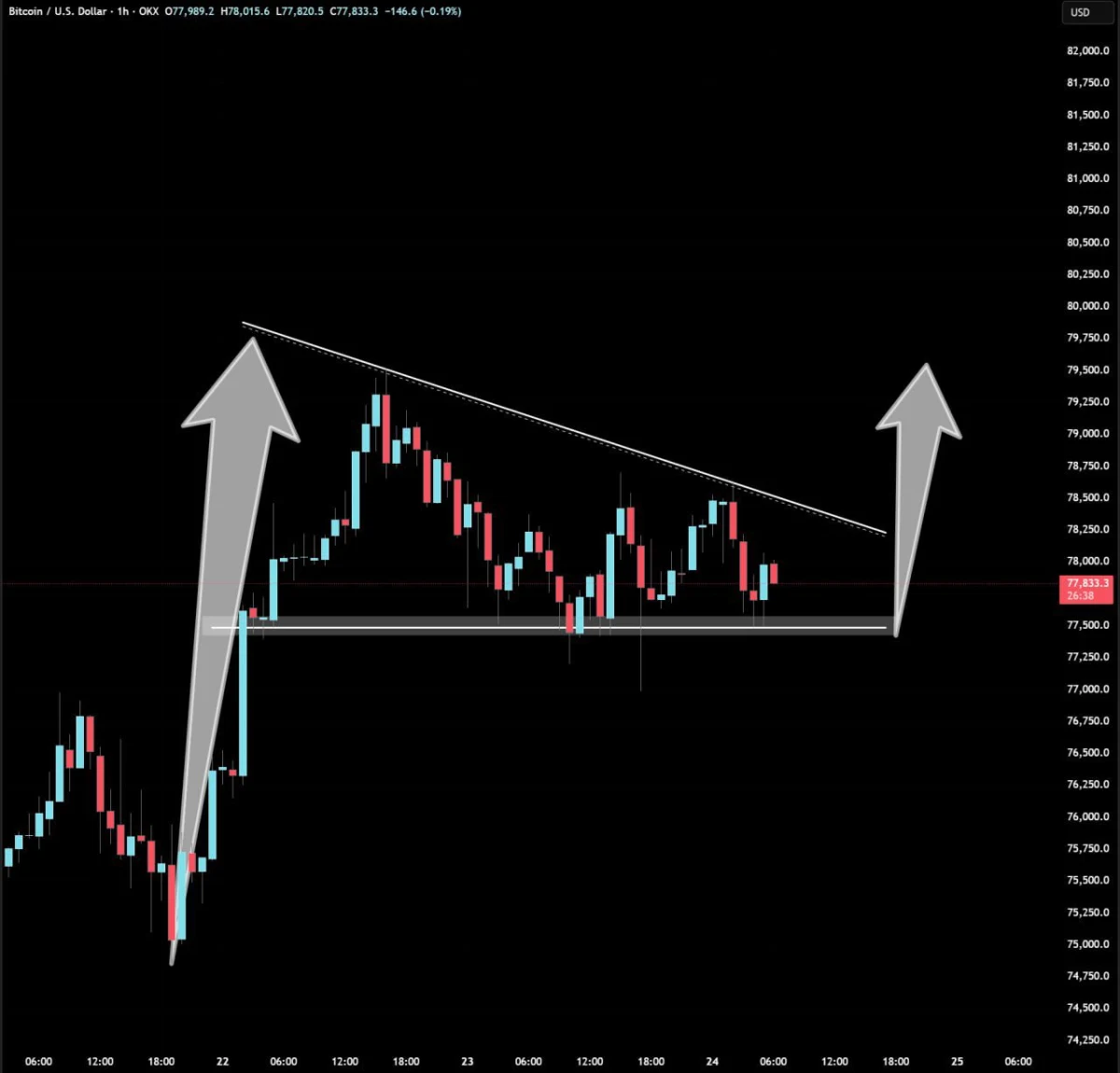 However, the setup depends on holding support. A breakdown below $77,500 would weaken the pattern and delay the upside continuation.