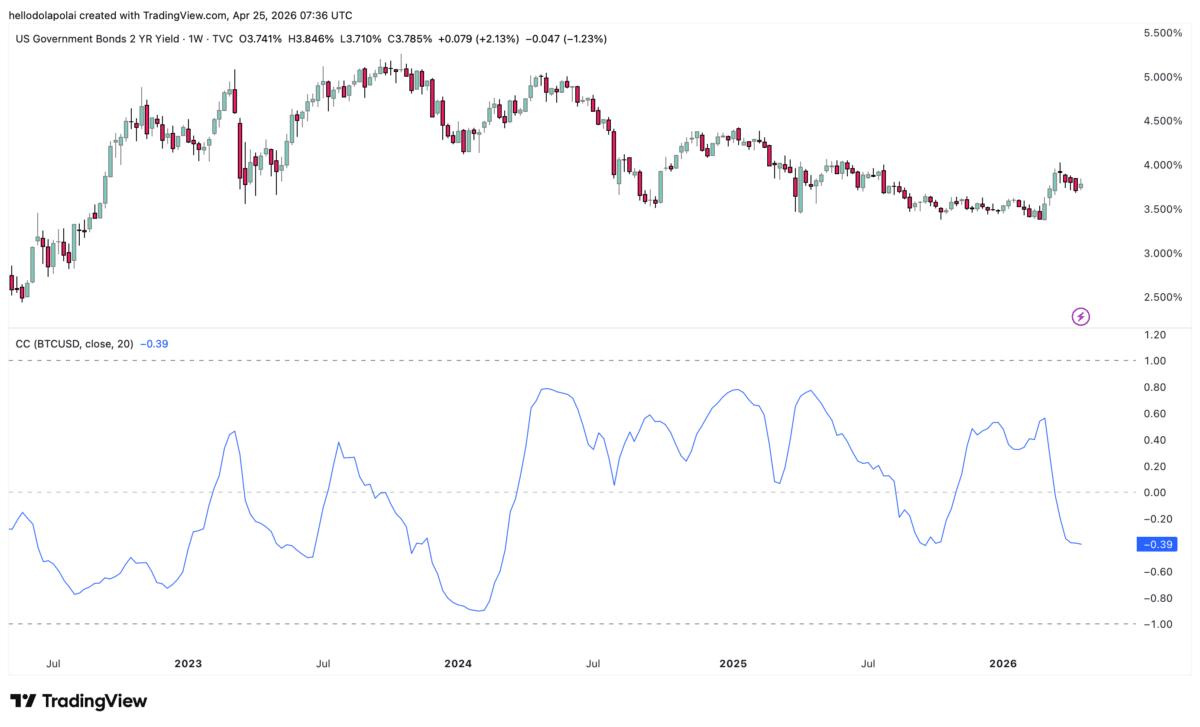 Current data shows a 39% correlation between Bitcoin and bond yields, leaving a significant degree of independence in price movement. This suggests that while higher yields may apply pressure, they are unlikely to dictate direction entirely.